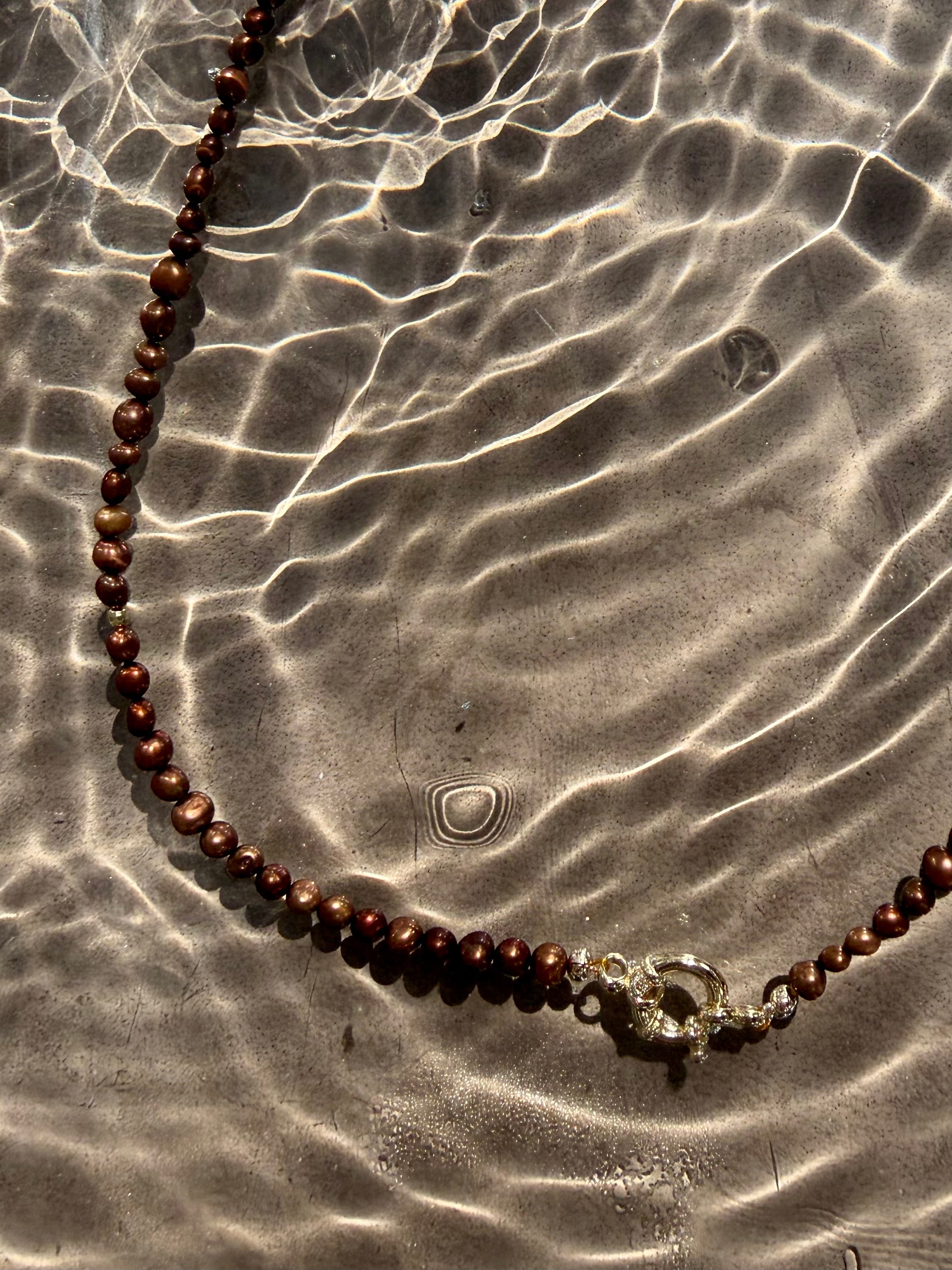 Warm glow, liquid bronze. This pearl necklace moves with you. Effortless, every time.